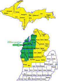 Northwestern lower Michigan is our primary service area. Assignments outside of this area (shown in yellow) can be accomodated. Just call to confirm availability.